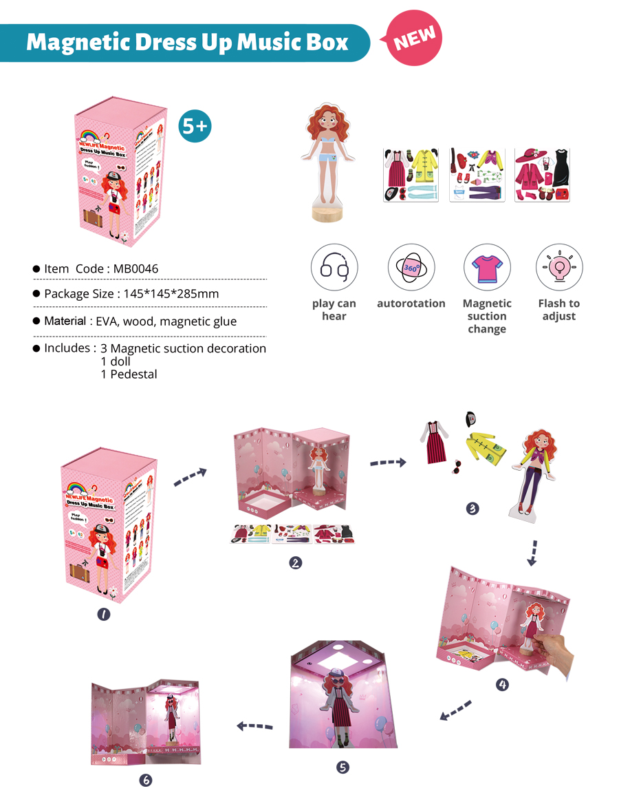 Magnetic music box is just to give you the touch of love. The newly upgraded magnetic game box is a hands-on puzzle, magnetic dress up, automatic rotation, and flash adjustment multi-element, multi-functional music box.